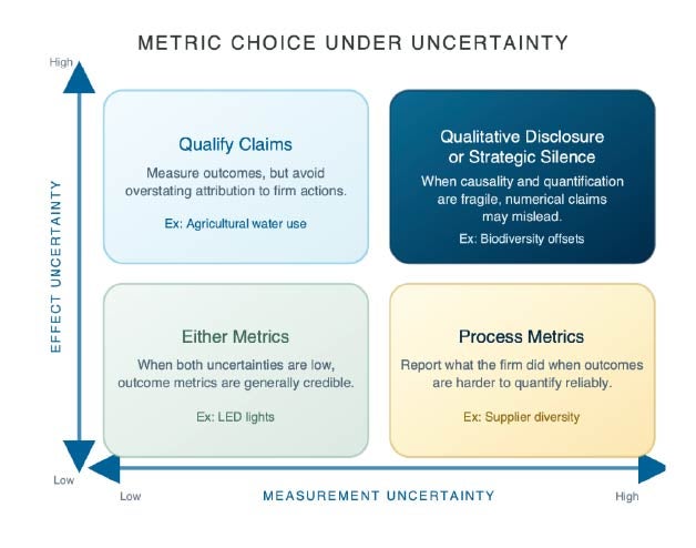When both effect and measurement uncertainties are low, like for an energy efficiency upgrade with precise utility meters and predictable savings, outcome metrics are credible. A company can report that it reduced building energy use by 18% annually and expect to be believed. But when measurement becomes murkier, then process metrics tend to hold up better.